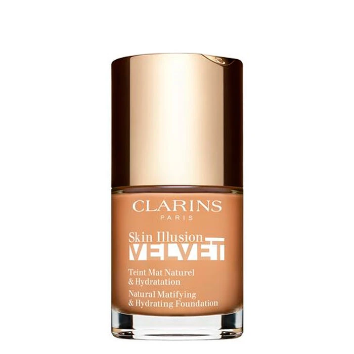 Skin Illusion Velvet de Clarins es un fondo de maquillaje sérum de cobertura ligera y acabado mate aterciopelado.