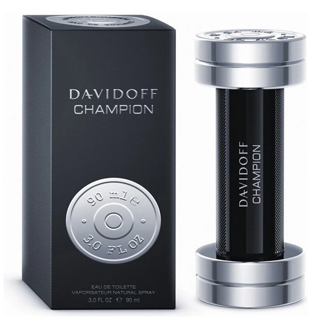 El frasco de Davidoff Champion Eau de Toilette simula una mancuerna sólida y robusta que contiene su jugo vigoroso en colores negros y metalizados que forman parte del original tapón.