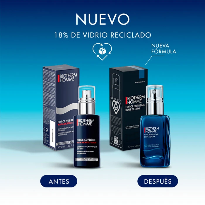 Biotherm Homme Force Supreme Blue Pro-Retinol Serum tiene una fórmula eco-concebida que cumple con estrictos requisitos de biodegradabilidad (fórmula 92% biodegradable). Su packaging ha sido eco-diseñado con una botella de cristal 20% reciclada y una caja exterior con papel 100% reciclado.