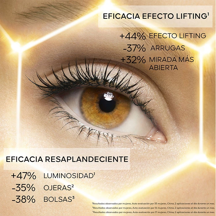 Su fórmula Renueva activadora de luminosidad enriquecida con un concentrado de miel blanca y un complejo descongestivo, actúa en la epidermis para iluminar intensamente y reavivar visiblemente la juventud de la mirada:
