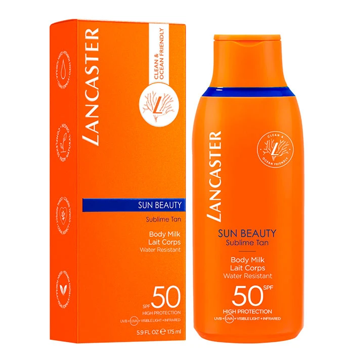 Sun Beauty Sublime Tan Body Milk SPF50 de Lancaster es una leche de protección solar muy elevada respetuosa con el océano.