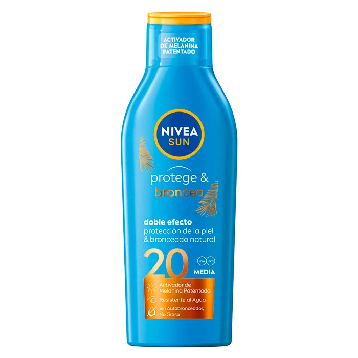 Contiene un activador de la melanina patentado que estimula el proceso natural del bronceado de la piel logrando un bronceado muy favorecedor. De textura no grasa, se funde al instante y facilita su rápida absorción. Nivea Protege & Broncea Loción Solar SPF20 está indicada para hidratar, proteger y obtener un bronceado natural y luminoso en todo tipo de piel.