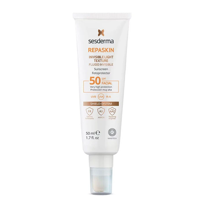 Su textura fluida de rápida absorción, sin brillos se distribuye uniformemente con un efecto mate y sedoso. Posee un acabado invisible, sin efecto blanquecino que facilita su aplicación. Sesderma Repaskin Fluido Invisible SPF50 es perfecto para garantizar la máxima protección en fototipos altos y bajos y prevenir el envejecimiento prematuro. La piel se rejuvenece y luce un bronceado perfecto.